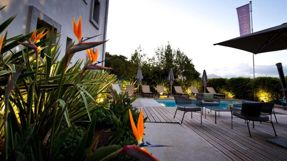 Piscine chauffée avec transats, pensée pour la détente en journée, surtout au retour des plages ou d’une sortie dans l’arrière-pays.